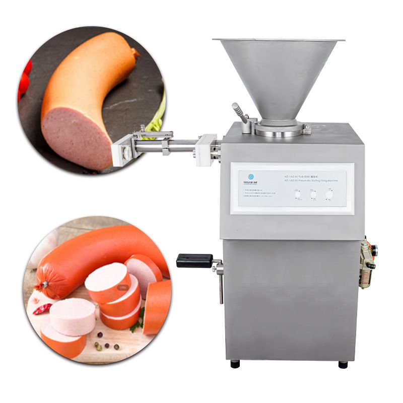 This automatic filling and linking machine is pneumatically powered, made of stainless steel, easy to clean and simple to operate, and the hot dog can be adjusted between 50-1000g.